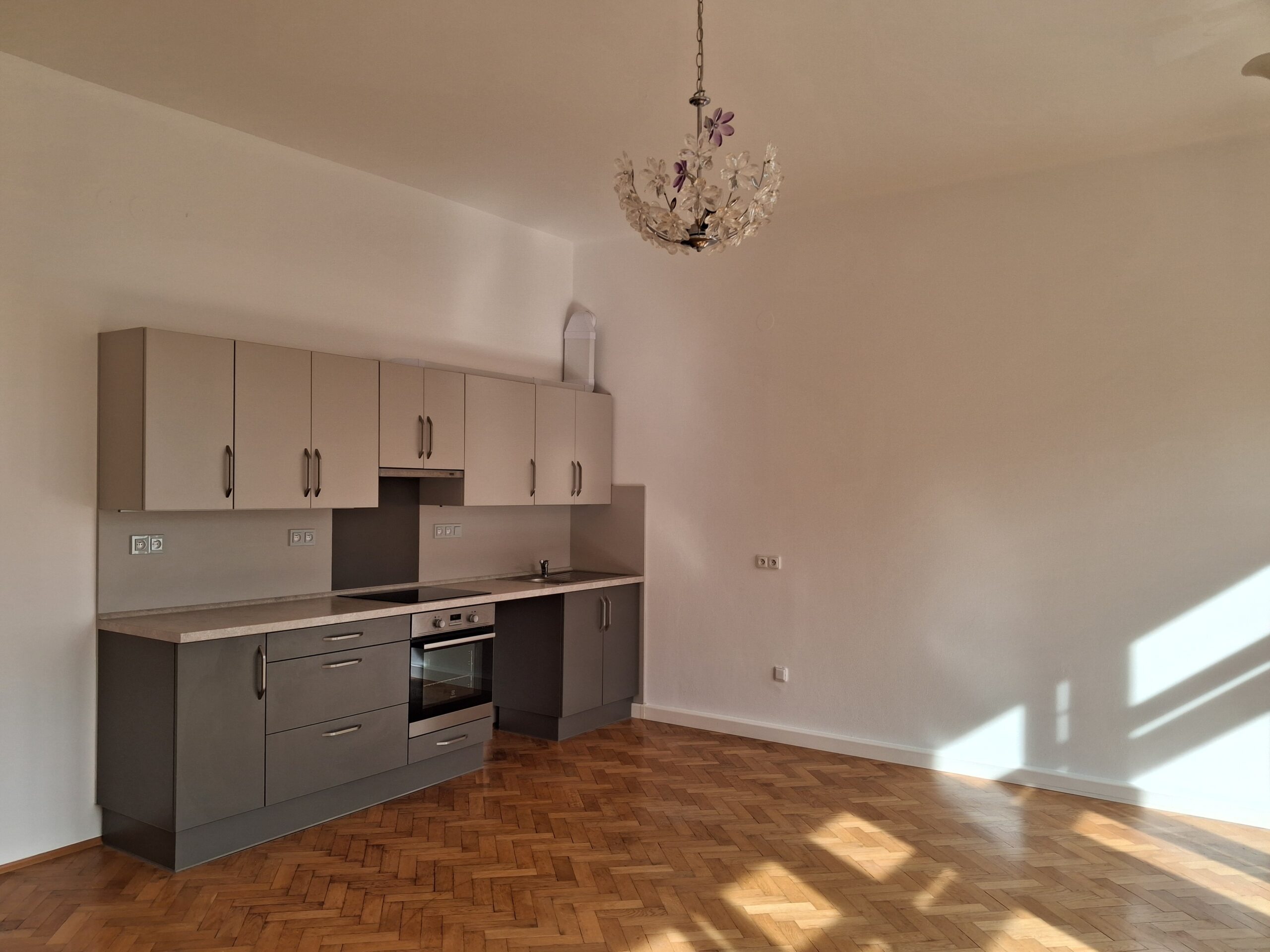 Dispozice bytu: vstupní chodba, pokoj, pokoj s kuchyňským koutem a vybavenou kuchyňskou linkou (trouba, varná deska,), lodžie, koupelna se sprchovým koutem, samostatné WC. Sklepní kóje.
